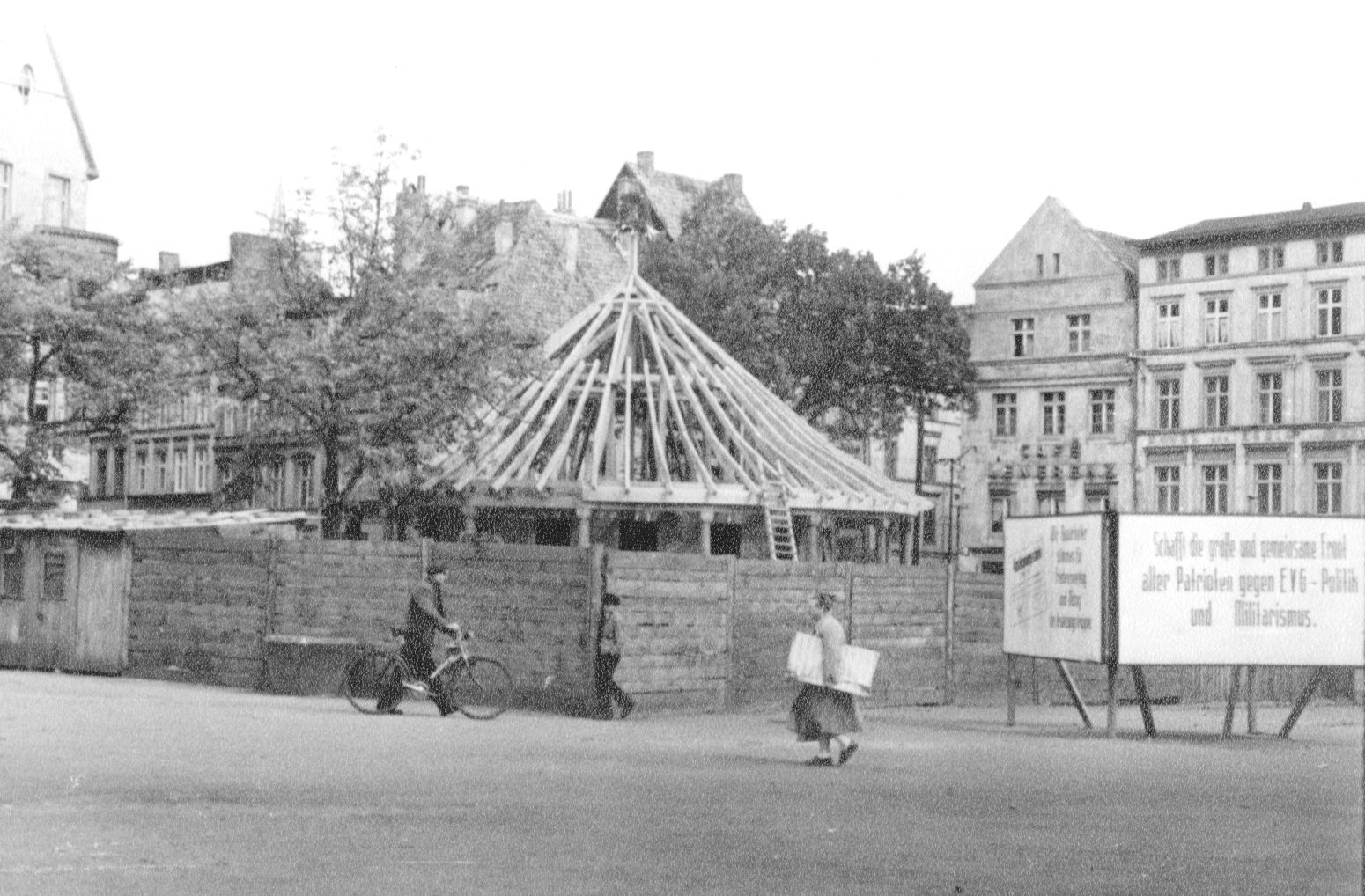 Abriss des Diakonathauses von St. Marien Neuer Markt 24, Südseite vollkommen freigelegt |