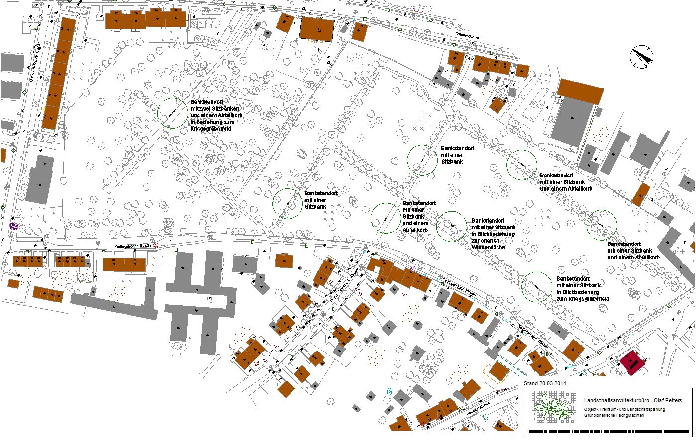 Um die Attraktivität und die Verweilqualität des historischen Friedhofs zu erhöhen, soll die Ausstattung mit Bänken und Papierkörben erneuert und auf wenige, ansprechende Standorte konzentriert werden.
