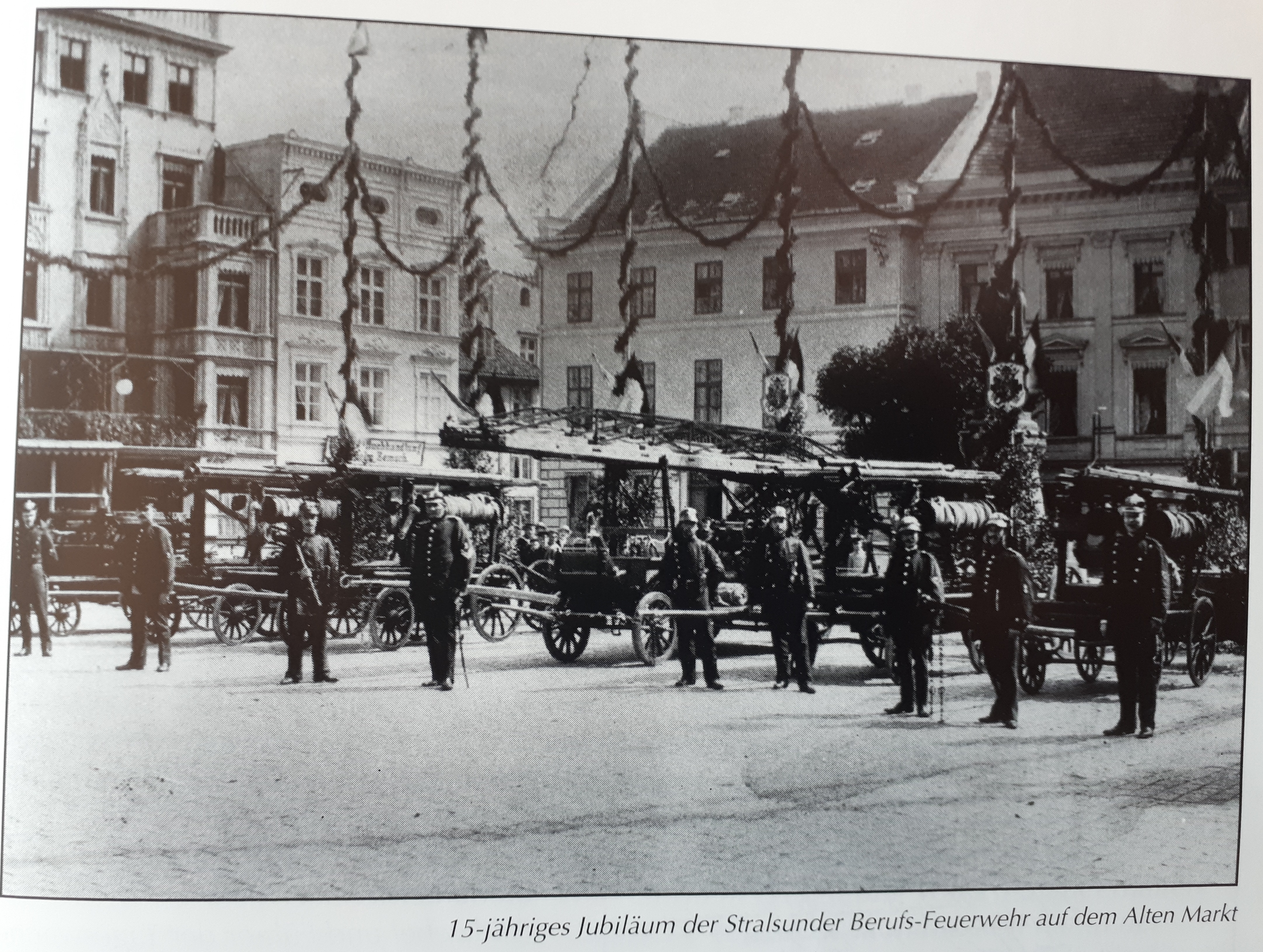 Der Rat beschloss die Einrichtung einer ständigen Feuerwache, die sich fortan im ersten Obergeschoss des Spritzenhauses zwischen dem Rathaus und dem Gebäude Alter Markt 10 befand. Im Erdgeschoss und auf dem Kirchhof standen die Spritze, der Wasserwagen und der „Utensilienwagen“. Zur schnellen Alarmierung wurde unter dem Rathausgewölbe ein Feuermelder angebracht. Zur Stralsunder Berufsfeuerwehr gehörten damals als Offiziere der Brandinspektor und sein Stellvertreter, sechs Oberfeuermänner und 24 „gemeine“ Feuerwehrleute.