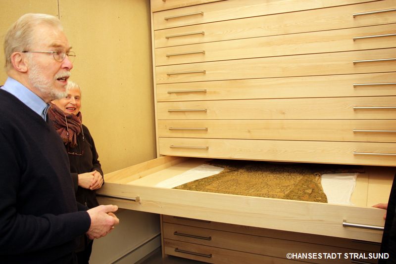 Dr. Maren Heun, Direktorin des STRALSUND MUSEUM, ist über die nun ideale Aufbewahrung des Stralsunder Paramentenschatzes im neuen Depot sehr glücklich: "Damit ist der Erhalt dieser wichtigen Sammlung für die nachfolgenden Generationen gesichert", so die Leiterin des Museums.