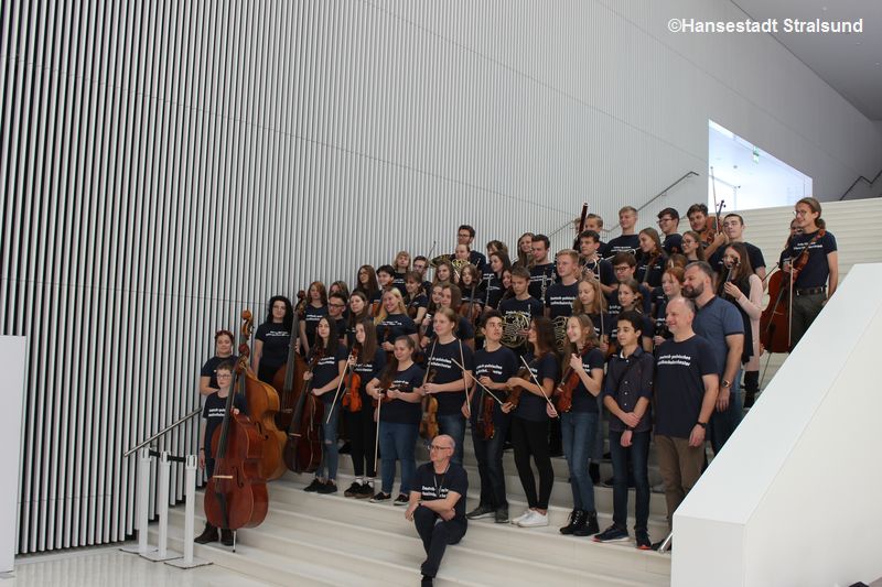 Die 56 jugendlichen Orchestermusiker zwischen 11 und 19 Jahren musizierten nach einer intensiven Probenphase in der Jugendherberge Burg Stargard nun mit Werken von Johannes Brahms, Maurice Ravel, Antonín Dvořàk, Jean Sibelius und Astor Piazzolla im voll besetzten Saal der Philharmonie. Das Dirigat teilten sich Jan Jakub Bokun, Klarinettist und Dirigent aus Wrocław, und Wolfgang Spitz, Dirigent und Leiter der Musikschule Stralsund.