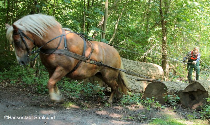 Neben einem dicken Baumstamm stoppt das Pferd, der Pferderücker legt eine Kette um den Stamm und gibt Kommandos. Nur wenig später liegt der Stamm direkt am Wegesrand zur Abholung bereit. Das Ganze wiederholt sich mehrere Male, bis eine erste Pause eingelegt wird.