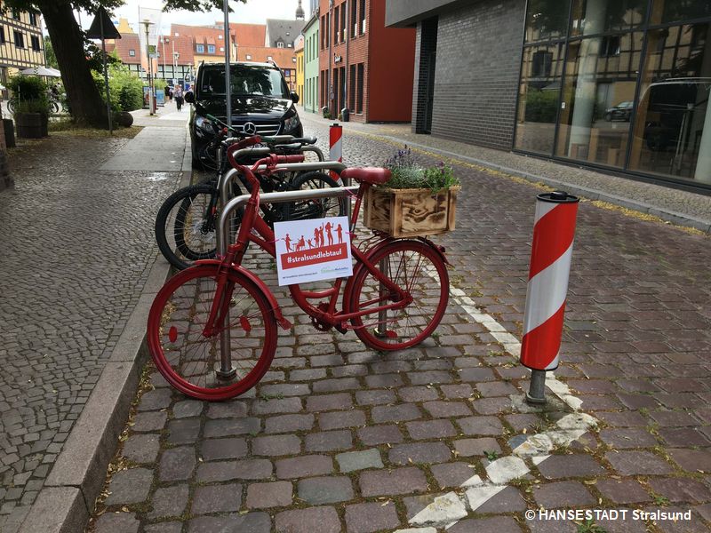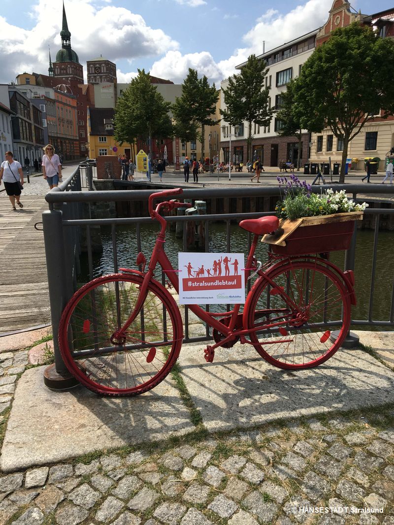 Die Stralsunder Werkstätten haben die Räder rot lackiert, Pflanzkästen gebaut und mit Sommerblumen bepflanzt. Die blühenden Zweiräder sind auch bereits Vorboten auf die Deutschland Tour, die am 25. und 26. August mit der Teampräsentation und der 1. Etappe in Stralsund startet.