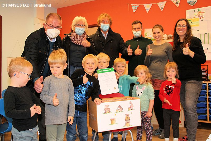 Diese Kitas dürfen sich über eine Kiste voller bunter Überraschungen freuen: Kita Blaubär, IB-Kita Knieperdamm, Kita „Biene Maja“ und Kita „Schatzkiste“. Diese Überraschungskiste wurde unterstützt durch eine Spende des Rotary Clubs Stralsund.