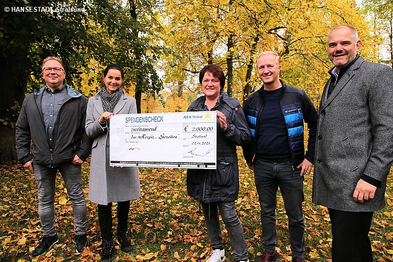 Während des Jubiläumstermins übergab ATA außerdem eine Spende. "Die Firma sieht sich verpflichtet, der Gemeinschaft etwas zurückzugeben. Der Beweggrund für eine Spende an das Hospiz 'Gezeiten' war", so Geschäftsführer Torsten Rothe, "dass wir bewundern, was sie tun und vor allem, wie sie es tun." Somit fiel die Entscheidung leicht, 2.000 Euro an zu übergeben. „Zum Leben gehört das Sterben und dabei geht es um das Wie. Damit ein jedes Leben in Würde sein Ende finden kann, bitte ich Sie um Unterstützung für unser Hospiz 'Gezeiten'", so der Appell von Oberbürgermeister Alexander Badrow.