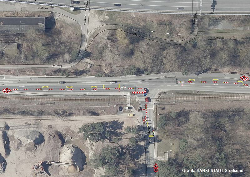 Aus diesem Grund ist es notwendig, den Verkehr im Einmündungsbereich auf den Fahrbahnen L 296 und Zum Kleinen Dänholm über Baustellenampeln zu regeln. Dies kann zeitweise zu Behinderungen führen, so dass empfohlen wird, diesen Bereich nach Möglichkeit über die Rügenbrücke zu umfahren.
