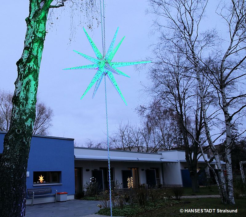 So leuchtet auch vor dem Hospiz auf dem Gelände der Wohlfahrtseinrichtungen ein Stern für die Menschen, die sich nicht alle 20 Stralsunder Sterne plus die drei in den Kirchen anschauen können.
