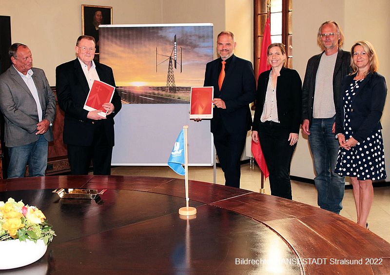 Heute (06. Juli) konnte im Rathaus der Hansestadt Stralsund der nächste Pachtvertrag für das 34 Hektar große Gelände des Maritimen Industrie- und Gewerbeparks Volkswerft unterzeichnet werden. Die German Sustainables GmbH geht bereits ab 15. Juli mit fast 6.000 m² Produktions- und Logistikflächen an den Start. Geplant ist, in Stralsund eine völlig neue Generation von Windkraftanlagen zu bauen. Unterzeichnet wurde der Vertrag von Oberbürgermeister Alexander Badrow und dem Geschäftsführer von German Sustainables, Hans-Jürgen Brandt. Zugegen waren außerdem OB-Stellvertreterin Sonja Gelinek, in deren Zuständigkeitsbereich die Volkswerft gehört, sowie der Amtsleiter für Planung und Bau Frank-Bertolt Raith und der Amtsleiter für Wirtschaftsförderung Peter Fürst. Alle drei waren zusammen mit ihren Ämtern maßgeblich an der Vorbereitung der neuesten Ansiedlung beteiligt.