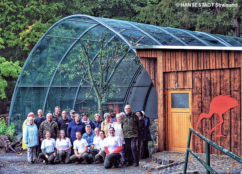 Die für die Errichtung der Voliere benötigten 50.000,00 Euro wurden von den Zoofreunden durch großzügige Unterstützung von Firmen und Vereinsmitgliedern sowie viele helfende Hände, darunter ebenfalls Vereinsmitglieder als auch Mitarbeiter des Zoos, erwirtschaftet. Das Projekt wurde über die letzten zwei Jahre vom Verein Zoofreunde Stralsund e.V. getragen, im Herbst fertiggestellt und konnte am 27. September an den Zoo Stralsund übergeben werden. Das Ergebnis kann sich sehen lassen. Mit Stolz präsentieren die Zoofreunde in einer feierlichen Übergabe die neue Anlage.