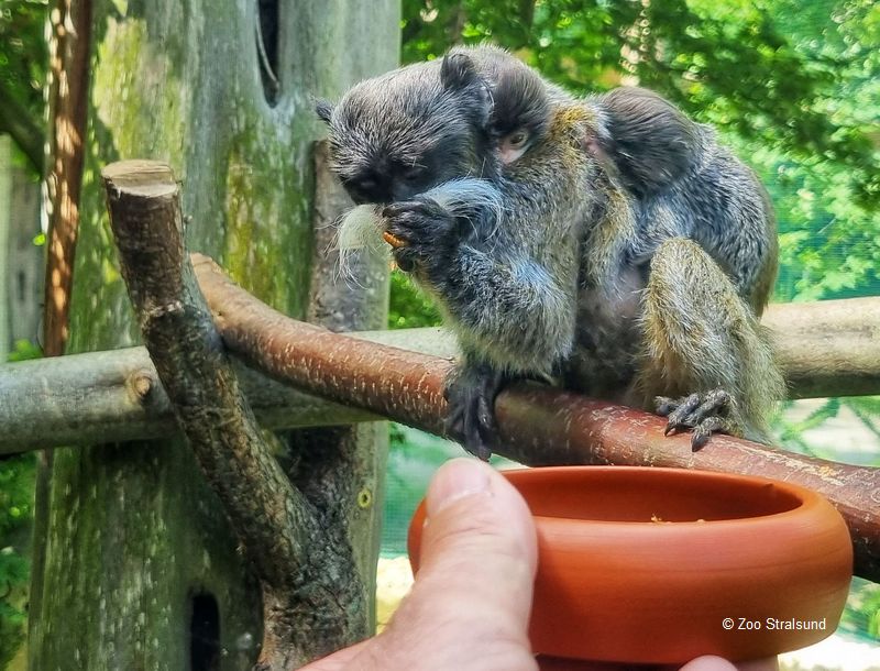 Besonders überraschend jedoch war die Zwillingsgeburt bei den Kaiserschnurrbarttamarinen. Wer hätte gedacht, dass das vermutlich älteste Männchen Europas unter den wachsamen Augen seiner Partnerin „Gloria“ noch einmal die Pflege zweier kleiner Äffchen aufnimmt. Schließlich tragen bei den Krallenaffen die Väter die Jungtiere.