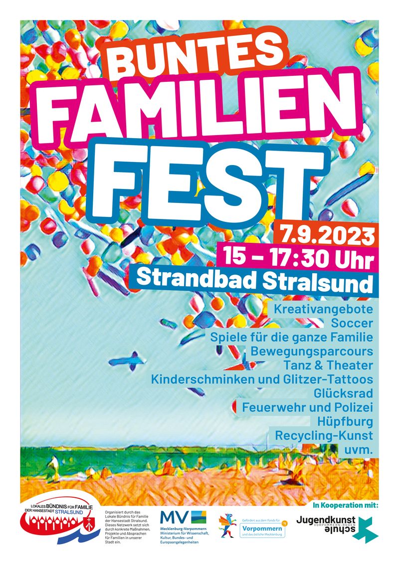 Das Lokale Bündnis für Familie der Hansestadt Stralsund freut sich, alle Familien herzlich zum Bunten Familienfest einzuladen, das am 7. September von 15:00 bis 17:30 Uhr am Stadtstrand Stralsund stattfinden wird. Dieses aufregende Event verspricht einen Nachmittag voller Freude, Aktivitäten und Erlebnisse für Groß und Klein.