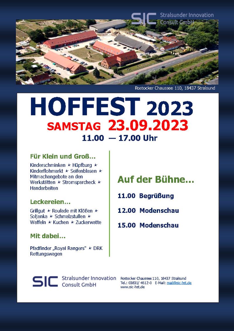 Das traditionelle Hoffest der SIC GmbH wird am 23.09.2023 von 11.00 bis 17.00 Uhr in der Rostocker Chaussee 110 stattfinden. Auf die Besucher wartet ein buntes Unterhaltungsprogramm. Die Kinder können sich auf spannende Mitmachangebote unserer Werkstätten, aufs Kinderschminken und auf die Hüpfburg freuen. Vorgesehen sind weiterhin ein Kinderflohmarkt und die Übergabe eines Wunschbaumes der Kinder an die Institutionen der Stadt Stralsund. Neben dem guten Essen wird die Modenschau ein Highlight des Hoffestes werden. Weitere Angebote werden sein: der Stromsparcheck, das DRK mit einem Rettungswagen, der Informationsstand Royal Rangers (Pfadfinder) und unsere offenen Second Hand Kaufhäuser.