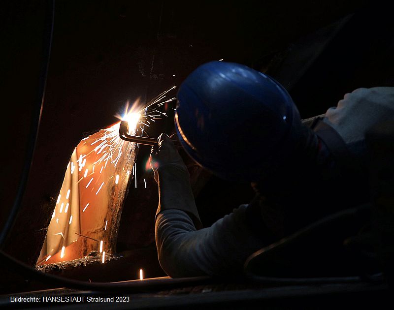Auf dem Dreimaster sind derzeit täglich ca. 50 Schiffbauer von der Fosen Stralsund GmbH gleichzeitig am Arbeiten. Dabei brennen sie schadhafte Segmente aus der Schiffswand heraus. Anschließend wird jeweils eine neue Platte eingesetzt und verschweißt., Zum Schluss wird die Naht noch glattgeschliffen, sodass an vielen Stellen des Schiffes gleichzeitig die Funken sprühen.