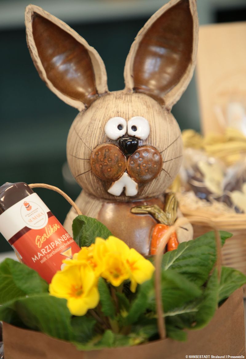 Dazu gehören die schon legendären Osterhasen aus Keramik, in liebervoller Arbeit in den Stralsunder Werkstätten hergestellt. Zu finden sind im Osterregal zudem Stralsunder Marzipan, dazu Sanddornprodukte und - quasi um die Ecke getöpfert - Rügener Keramik aus den Werkstätten in Kransdorf.