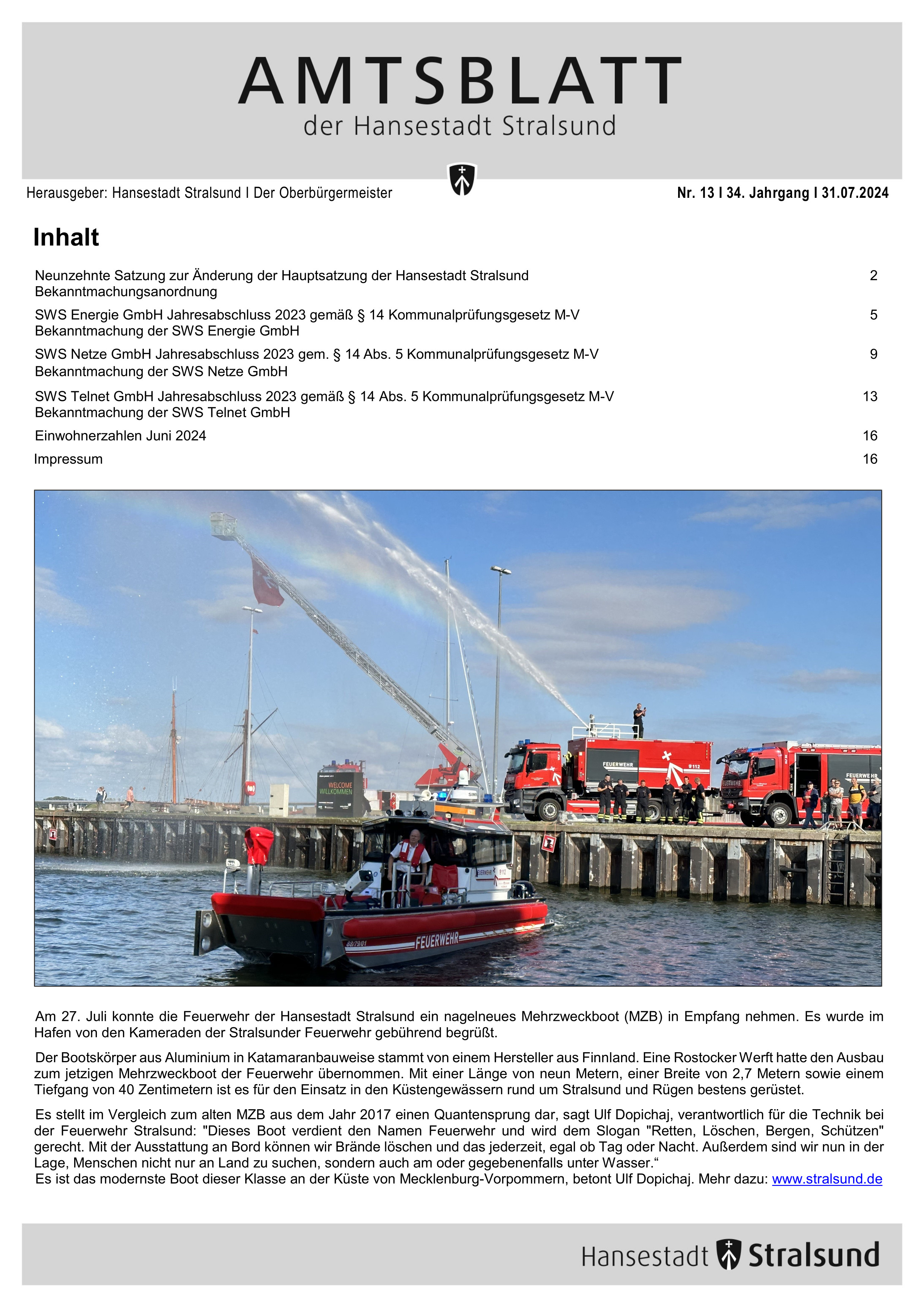 Außerdem im Amtsblatt: die Jahresabschlüsse 2023 der SWS Energie GmbH, SWS Netze GmbH und der SWS Telnet GmbH, die aktuellen Einwohnerzahlen und ein kurzer Eindruck von der Ankunft des neuen Mehrzweckbootes der Stralsunder Feuerwehr.