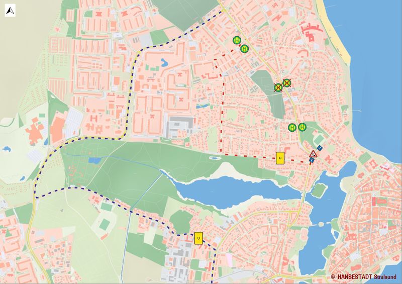 Der großräumige Fahrzeugverkehr, der aus der Tribseer Vorstadt kommt, wird in Richtung Knieper West und Knieper Nord über die Strecke Carl-Heydemann-Ring - Barther Straße - Grünhufer Bogen umgeleitet.