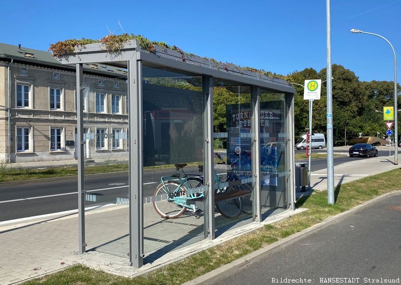 Seit 2022 wurden zehn Wartehallen mit bepflanzten Dächern neu errichtet, die damit insgesamt 70 Quadratmeter begrünen. Den Anfang machte die Haltestelle am Tribseer Damm, in der Nähe des Jobcenters. Diese war gleichzeitig die erste begrünte Bushaltestelle in ganz Mecklenburg-Vorpommern. Nun sind neun weitere dazu gekommen, wovon vier im September fertiggestellt wurden. Die neuesten Wartehäuschen befinden sich beim Werftkreisel.