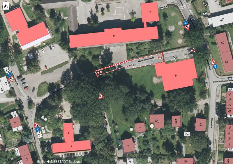 Wie für die vorbereitenden Arbeiten bleibt die Wallensteinstraße von der Straße Vogelwiese aus über die südliche Einmündung Wallensteinstraße erreichbar. Der Baustellenbereich ist für alle Verkehrsteilnehmer gesperrt, auch für den Fußgänger- und Radverkehr. Von der Vogelwiese aus wird lediglich eine Zuwegung zur Sporthalle eingerichtet.