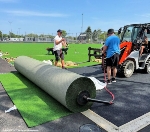 Seit Wochenbeginn wird auf dem Mehrzwecksportfeld im "Stadion an der Kupfermühle" der neue Kunstrasen verlegt. Der vier Meter breite "immergrüne" Rasen wird Rolle für Rolle ausgebracht. Jede Rolle wiegt 400 kg und wird vom Radlader abgespult. Insgesamt 24 Stück benötigen die Arbeiter, um das gesamte Feld auszulegen. Jede Bahn ist 45 m lang. Nachdem die Bahnen ausgelegt sind, werden sie miteinander verklebt.