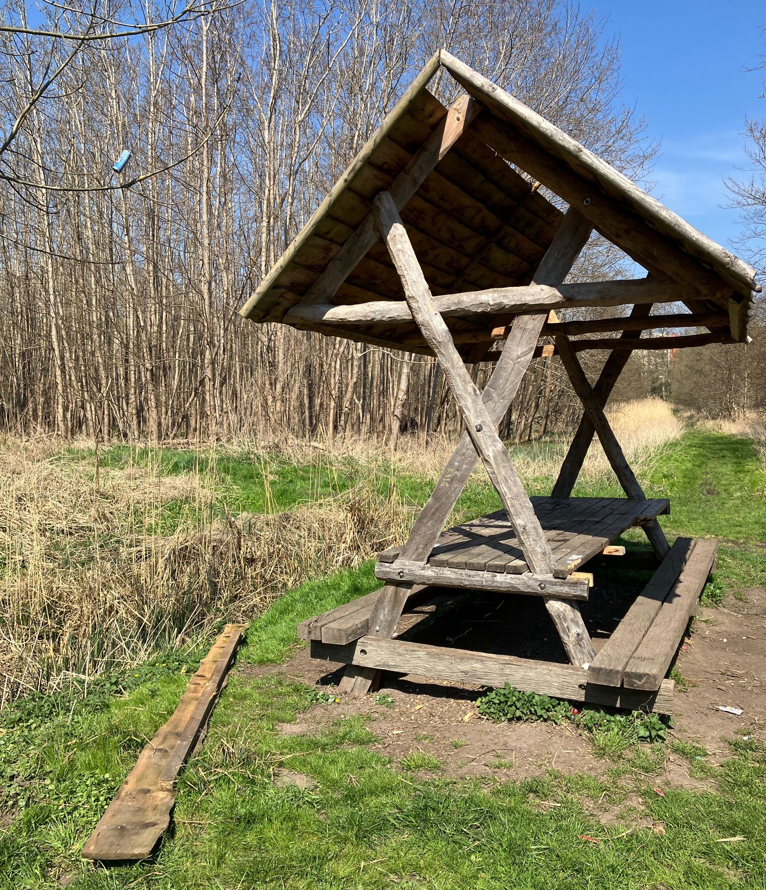 Mitten im Stralsunder Stadtwald stand seit Mai 2022 eine überdachte Sitzgruppe – eine sogenannte „Waldhütte“, komplett aus Holz. Die Hütte am Mühlgraben, zwischen Naturwald und dem Rohrplan auf dem Weg zum Papenhagen, war als Ort zum Verweilen und Picknicken gedacht. Besucherinnen und Besuchern sollten dort die idyllische Natur im Stadtwald genießen können - so zumindest die Idee.