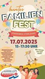Am Donnerstag, den 17. Juli, lädt das Lokale Bündnis für Familie der Hansestadt Stralsund herzlich zum großen Familienfest im Strandbad ein. Von 15:00 bis 17:30 Uhr erwartet euch ein fröhliches Programm für die ganze Familie – und das bei freiem Eintritt!